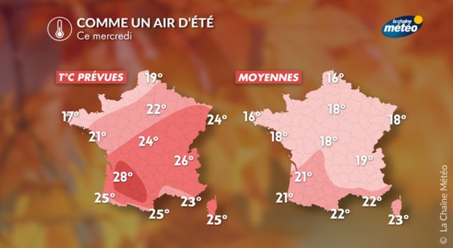 Avec l'arrivée d'une masse d'air subtropicale sur la France, les températures ont bien remonté depuis ce week-end, mettant fin à la vague de fraicheur de la dernière décade de septembre. Même si les brouillards freinent parfois la hausse diurne du thermomètre, les températures sont, en moyenne, 3°C au-dessus des normales de saison. Ce mercredi signe le pic de douceur de cette semaine.