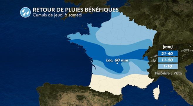 Jeudi, une première perturbation océanique pas très active arrivera par le nord-ouest. Mais c'est notamment entre vendredi et samedi qu'une autre perturbation, plus active, ondulera sur les deux tiers nord. Elle évoluera lentement et favorisera l'installation de précipitations durables sur les régions situées entre les Pays de la Loire, les Charentes, le nord de l'Auvergne et la Franche-Comté. Les cumuls de pluie devraient atteindre 20 à 40 millimètres, et localement jusqu'à 60 mm par effet de blocage sur les contreforts du Massif-Central.