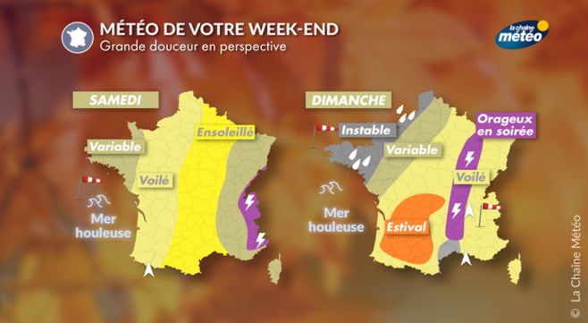 Pour votre week-end (samedi 22 et dimanche 23 octobre), les conditions météo sont parfois instables, mais la grande douceur se maintient (de l'ordre de +3°C au-dessus des moyennes). Des nuances régionales sont présentes, avec un coup de vent attendu en Bretagne dimanche. Mais au total, le ressenti est assez agréable avec de belles éclaircies et un ressenti printanier.