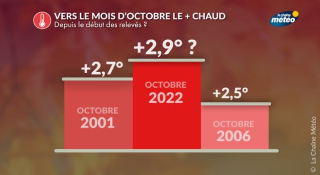 Au final, ce mois d’octobre 2022 sera historiquement chaud. Avec un écart à la normale qui devrait être proche de 3°C, il a de bonnes chances de se placer en 1ère position des octobres les plus chauds devant 2001 (+2,7°C) et octobre 2006 (+2,5°C).