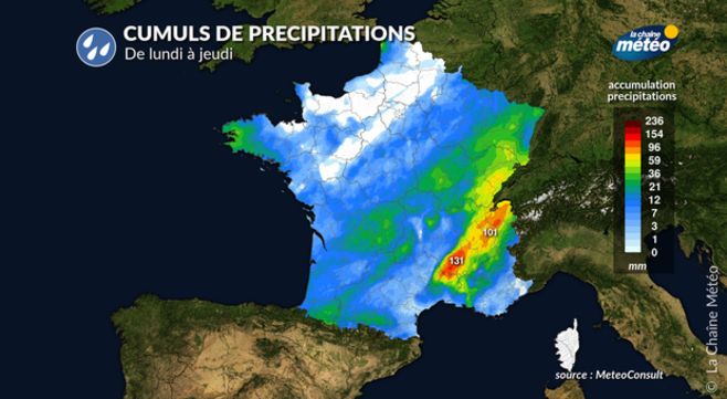 La perturbation arrivée lundi par la Manche mettra deux jours pour traverser la France, d'ouest en est. Elle s'accompagnera de bonnes pluies, et parfois d'orages, des Cévennes et de la Provence Côte d'Azur aux Alpes à la Franche-Comté jusqu'en Alsace mercredi, alors qu'à l'ouest, c'est un temps plus calme qui s'imposera, sauf près de la Manche où il y aura des averses.