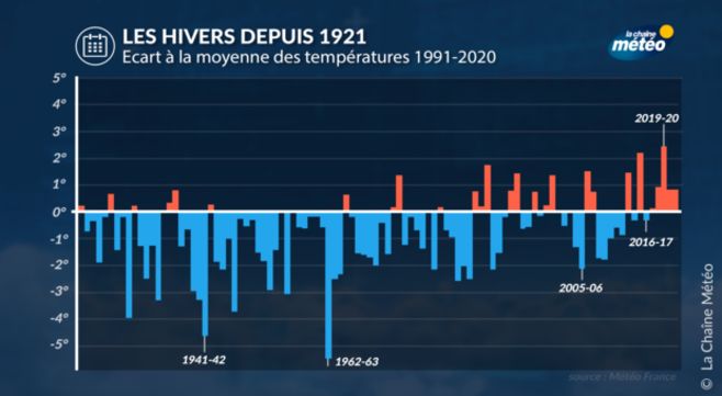 Depuis 20 ans, les hivers ont connu une profonde transformation en France. Alors qu’une série froide s’est manifestée entre 2009 et 2013, ils sont désormais supérieurs aux moyennes de saison. Cela n’exclut pas des périodes plus froides mais dont les rigueurs ne sont plus comparables aux hivers du XX siècle. Les indicateurs thermiques des hivers depuis 1935, qui indiquent la moyenne au niveau de la France, montrent bien cette évolution : la moyenne décennale des températures des hivers était de 3,9°C jusqu’en 1948, de 4,6°C jusqu’en 1958, de 4,4°C jusqu’en 1968, de 5,4°C jusqu’en 1978, de 5°C jusqu’en 1988, de 5,7°C jusqu’en 1998 et 2008, puis de 6,1°C jusqu’en 2018. Nos hivers se sont réchauffés, en moyenne, de 2°C en France.
