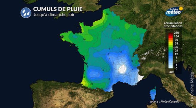 Les cumuls pluviométriques vont donc s'additionner à chaque perturbation. Certaines régions vont cependant peiner à bénéficier de ces pluies, en particulier l'Occitanie (Roussillon et plaine toulousaine), ainsi que les plaines intramontagnardes comme la Limagne, la plaine du Forez et la vallée du Rhône. Les autres régions auront des cumuls parfois significatifs d'ici ce week-end, notamment les côtes atlantiques et de la Manche ainsi que l'ouest des régions à reliefs : Limousin, l'ouest de l'Auvergne, la Franche-Comté, ou encore les Alpes. Les Pyrénées profiteront de ces perturbations surtout à partir de ce week-end, quand le flux basculera au nord-ouest.
