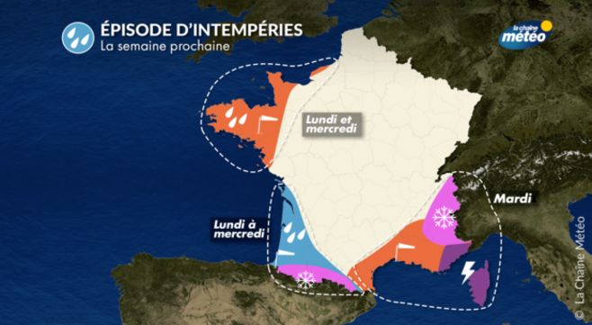 Dans un contexte météorologique désormais très perturbé, de fortes dégradations vont toucher la France cette semaine, aussi bien au nord qu'en Méditerranée. Le nord-ouest, le sud-ouest et la Corse sont les plus exposés.