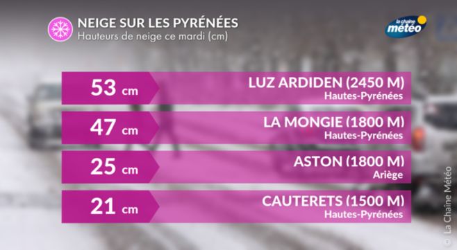 Les perturbations se succèdent et viennent même se bloquer, dans le flux de nord-ouest, sur la chaine des Pyrénées. Les couches de neige observées dans les stations sont de 20 à 50 cm entre 1500 et 1800 mètres et jusqu’à plus de 50 cm au-delà. Les perturbations sont un peu moins actives, en arrivant à l’est du pays et en atteignant les reliefs des Vosges, du Jura et des Alpes. Néanmoins, les couches de neige observées ce mardi dans les Alpes étaient de 15 à 40 cm en moyenne entre 1600 et 2000 mètres.