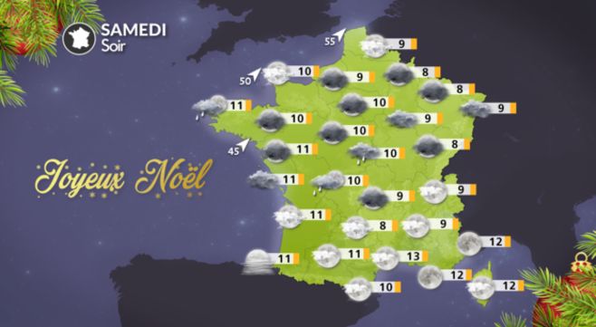 Dimanche 25 décembre, jour de Noël, la France restera coupée en deux avec un temps souvent gris et humide au nord de la Loire, avec des pluies plus soutenues sur les Hauts-de-France, tandis que les régions de la moitié sud devraient profiter d'un temps sec et ensoleillé. L'après-midi sera printanière du sud-ouest au centre-est et autour de la Méditerranée. Quelques entrées maritimes pourront concerner le Languedoc avec un ciel très nuageux.