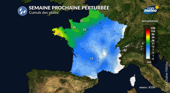 La perturbation s'étirera des Pyrénées aux Alpes à l'Alsace jusqu'en Méditerranée avec un temps maussade et venté. Il neigera au-dessus de 1800 mètres. À l'arrière, vous retrouverez un ciel variable avec des averses près des côtes de la Manche dans un air légèrement rafraîchi.