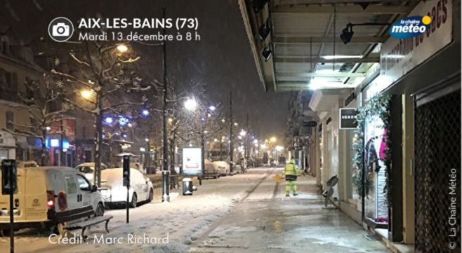 En Rhône-Alpes, 2 à 5 cm de neige ont recouvert le sol d'Annecy, d'Aix les Bains, d'Annecy, de Chambéry et d'Albertville le 13 décembre. De la neige a saupoudré le sol de Lyon à Montélimar jusqu'à Valence.