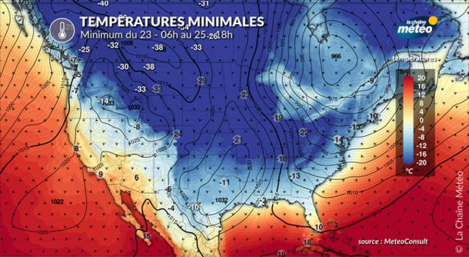 Cet air froid atteint la côte du Texas où l'on relevait -9°C à Houston, l'une des valeurs les plus basses depuis 1983 en décembre. Indiquons aussi qu'en raison du vent fort, la température ressentie atteint les -40 à -50 dans le nord des USA et au Canada, avec des valeurs surréalistes calculées à -70, ce qui entraîne des conditions mortelles. L'état d'urgence, déclaré dans de nombreuses régions, invite justement les habitants à rester calfeutrés chez eux et à ne pas sortir pour éviter toute prise de risque dangereuse.