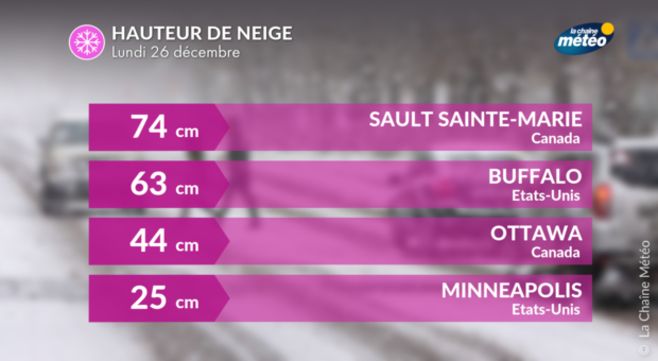 Les hauteurs de neige atteignaient le 25 décembre 63 cm à Buffalo (État de New-York, USA), 44 cm à Ottawa (Ontario, Canada) et 25 cm à Minneapolis (Minnesota, USA). Des congères de 3 mètres ont enseveli des routes et des maisons en Ontario. Ces valeurs d'enneigement sont très importantes, mais au Noël 1983, les hauteurs de neige étaient encore plus importantes sur les villes citées, avec plus de 50 cm de neige au sol (hors congères).