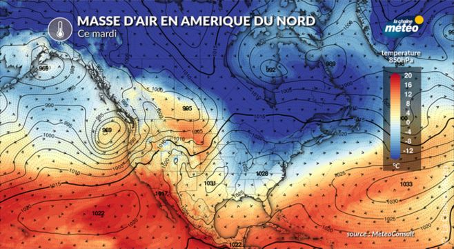 Les températures sont déjà nettement remontées à l’est des Rocheuses, comme à Denver ce mardi où la température maximale atteignait déjà 15°C, alors qu’il y faisait -30°C jeudi dernier, soit 45°C de hausse en cinq jours. Cet air doux remontera ce mercredi et ce jeudi, en direction des Grands Lacs. Il gelait encore mardi à Chicago avec près de -15°C en matinée alors que la maximale ce mercredi devrait approcher les 3°C et celle de jeudi les 10°C, soit une hausse de 25°C en près de 48h !