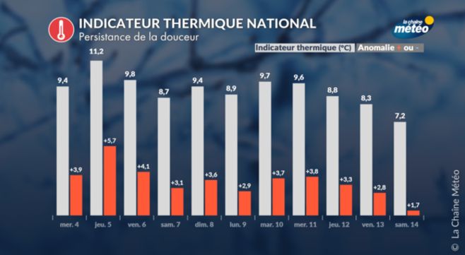 Cette semaine, on a l'impression qu'il fait moins doux, mais les températures restent encore de 3 à 5°C supérieures aux moyennes jusqu'à jeudi, ce qui est notable. Les températures nocturnes seront moins élevées que lors du week-end, mais en journée, il fera encore de 11° à 18°C du nord au sud.