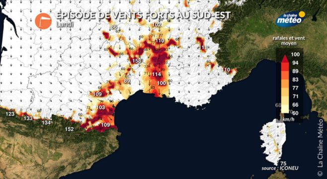 Près de la Méditerranée, le ciel est plus nuageux que dimanche, dans une ambiance toujours aussi froide. Un froid accentué par le mistral et la tramontane qui soufflent jusqu'à 90 km/h en rafales. En soirée, il faut s'attendre à un brutal renforcement du vent entre le littoral azuréen et les côtes varoises en lien avec la remontée d'une petite dépression de la Corse vers le continent. De fortes averses et giboulées sont même possibles dans la nuit de lundi à mardi le long des côtes et des rafales à 110 km/h sur les îles du Levant.