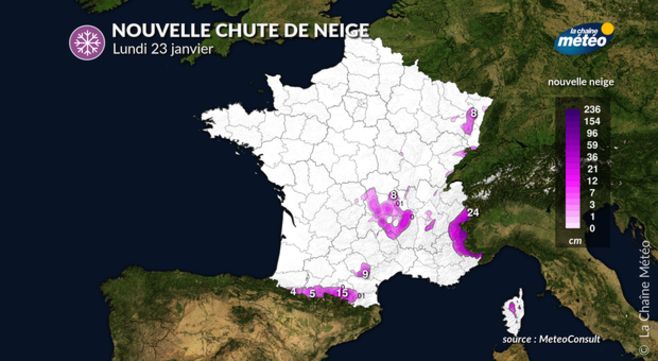 Du Jura à Rhône-Alpes au sud des Alpes, c'est un temps gris et froid qui domine dans les vallées et les plaines, alors qu'au-dessus de 1200 mètres d'altitude, le soleil l'emporte jusqu'en milieu d'après-midi. Puis le ciel se couvre avec l'arrivée de neige sur les reliefs frontaliers de l'Italie le soir. Du Queyras au massif du Mercantour, prudence, car la couche pourrait atteindre 50 cm entre lundi soir et mardi matin vers 1300 mètres d'altitude ! La bise est sensible, soufflant jusqu'à 50 km/h en rafales et accentue le ressenti glacial.