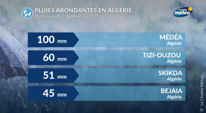Ce mauvais temps se caractérise par des précipitations abondantes et régulières sur les régions littorales de l’Algérie et de Tunisie, mais également toutes les montagnes algériennes. Des cumuls de pluies de 50 à 100 mm sont déjà atteints depuis la mi-janvier sur de nombreuses villes côtières de l’est de l’Algérie. Or, on attend, d'ici à vendredi prochain, jusqu'à 100 mm de pluies supplémentaires, soit l'équivalent d'un mois et demi de précipitations supplémentaires.