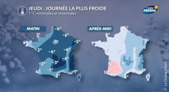 Même s'il fait froid la nuit avec des gelées parfois fortes au nord-est et centre-est (entre -7 à -5°C), les seuils de vagues de froid ne seront jamais atteints, car l'après-midi grâce à un soleil généreux, on attend de 5 à 10 °C de l’Alsace au pays basque et jusqu’à 11 °C en Méditerranée. Le mercure affichera des valeurs 2 à 3°C sous les normales de saison.