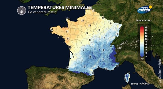 La douceur du matin est notable sur une large moitié nord du pays, y compris dans l'est, mais sous la grisaille humide. Le tiers sud-est conserve le même type de temps, avec une grande amplitude thermique entre le froid relatif du petit matin et la douceur qui s'accentue cet après-midi.