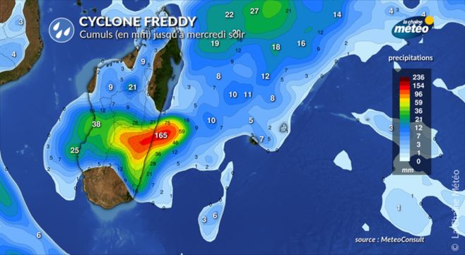 Avec des points similaires à Batsirai en 2022, le cyclone Freddy a touché la côte orientale en catégorie 3 en touchant les terres. Les rafales ont atteint 130 km/h avec des pointes estimées jusqu'à 180 km/h et des vagues de 10 mètres. Il a fait plusieurs victimes et des dégâts jugés considérables. En touchant terre, le cyclone a faibli pour redevenir une simple dépression tropicale en ressortant de l'autre côté de l'île, dans le canal du Mozambique. Les pluies et les vents restaient cependant encore forts ce mercredi.