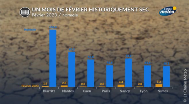 Du 1er au 21 février, le cumul de pluie moyen sur 30 villes de référence atteint 2,5 millimètres pour une normale mensuelle de 52,3 millimètres, soit un déficit de pluie de 95% en moyenne sur la France. A ce jour, il s'agit donc du mois de février le plus sec jamais enregistré depuis 1959, largement en tête devant le mois de février 2012 où le déficit de pluie sur l'ensemble du mois était de 76%.
