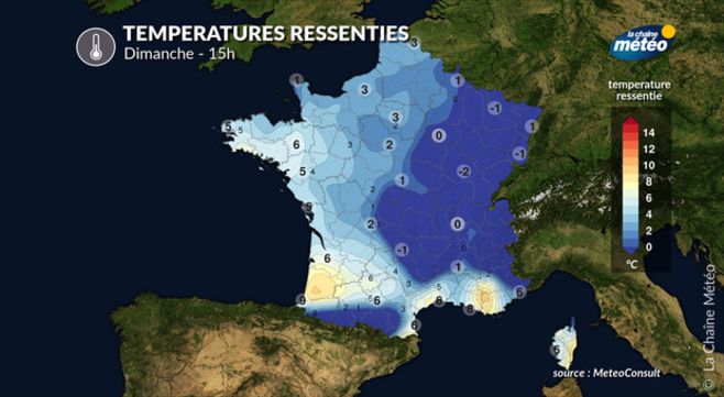 Sur le reste de la moitié nord, jusqu'au centre du pays, à l'Aquitaine, au Midi-toulousain, vous avez du soleil. Mais il s'agit d'un froid soleil d'hiver accentué par une bise sensible, soufflant jusqu'à 50 km/h en rafales.