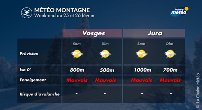 C’est un beau week-end en perspective pour les Vosges et le Jura, mais avec un froid de plus en plus mordant. La bise se lèvera et se renforcera pour souffler entre 50 et 70 km/h dimanche. Le ciel néanmoins restera peu nuageux avec un soleil dominant, mais le ressenti au vent sera glacial. Des ressentis autour de -10 seront possibles en station.