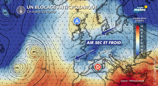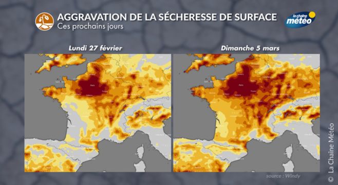 Cette situation restera figée sur l'Europe de l'ouest jusqu'en début de semaine prochaine. Le temps sec et froid avec la bise va s'imposer sur l'hexagone ces prochains jours, hormis en Corse jusqu'à mercredi. Le vent va assécher encore davantage les sols superficiels. Le bassin parisien et le tiers nord-est du pays seront les plus concernés par cet asséchement supplémentaire, tandis que le bénéfice des pluies du sud disparaîtra, sauf en certaines zones du sud-ouest et en Corse.