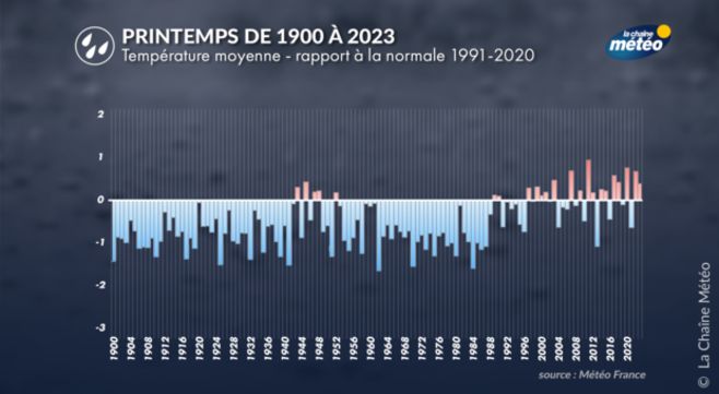 Avec l’été, le printemps est la saison qui se réchauffe le plus en France. Pour le printemps, l’évolution est très nette depuis les années 1990, avec une hausse de 3 °C des températures moyennes saisonnières. L’arrivée des « beaux jours » devient de plus en plus précoce depuis les années 2015, avec un réchauffement climatique plus marqué que pour les autres saisons. Auparavant, cette saison était souvent froide, humide et neigeuse malgré une période chaude entre les années 1940 et 1960. Mais, depuis le tournant des années 1990, les printemps sont devenus de « belles saisons » aux allures déjà estivales dès le mois de mai. 2011 fut, à cet égard, le printemps le plus chaud et le plus sec sur notre pays depuis le début des relevés. Plus proche de nous, mai 2022 a été le mois de mai le plus chaud jamais observé avec des températures déjà caniculaires.