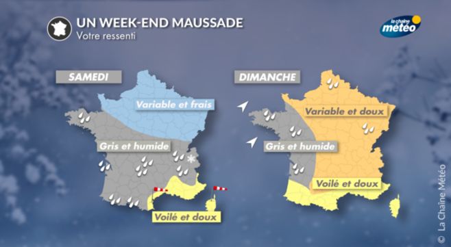 Le flux océanique concerne notre pays pendant le week-end, avec des pluies, mais aussi des éclaircies. Seuls les bords de la Méditerranée conservent un temps sec, mais toujours très venté. Pour ces deux jours, chacun a droit quand même à des périodes d'éclaircies dont il faut profiter. Les températures font le grand écart entre un bref coup de froid ce samedi au nord-est et le redoux général attendu dimanche.