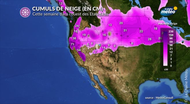 La Californie n’en a pas fini avec la pluie et la neige. Cette semaine, de nouvelles perturbations sont attendues, le long de la Côte ouest. Ces perturbations seront également accompagnées d’une descente d’air froid de l’ouest canadien. Outre les fortes pluies, c’est la neige qui tombera à nouveau en abondance en montagne dès 600 à 1200 mètres d’altitude, voir plus bas dans la partie nord de la Californie. Les états de Washington et de l’Oregon seront également concernés. Dans ces deux derniers états, la neige pourrait même tomber jusque dans les plaines en milieu de semaine. Le sud de la Californie devrait être plus épargné cette fois-ci, mais il tombera entre 100 et 150 mm de pluie sur les reliefs du nord de l’état avec près d’un mètre de neige, au-delà de 1000 mètres d’altitude. La limite pluie/neige est prévue s’abaisser mardi et mercredi autour de 300 à 600 mètres dans la Sierra et les reliefs côtiers du nord de l’état.