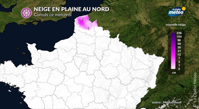 Les pluies soutenues sont de retour sur les 2/3 nord du pays. Au contact de l’air froid présent sur l’extrême nord, elles se transforment en neige. Cette neige tient au sol sur le Nord-Pas-de-Calais avec 2 à 3 cm, loc. 5 cm sur les collines du Boulonnais et de l’Artois. Le temps reste sec sur 1/3 sud et très doux pour la saison.