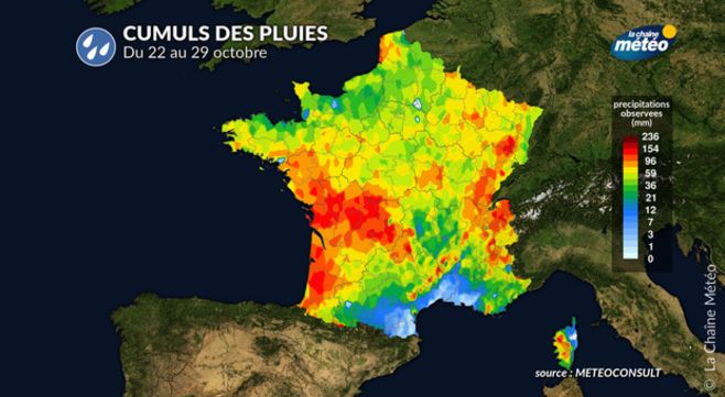 Depuis la mi-octobre, les perturbations s'enchainent sur la France en épargnant peu de régions. Les pluies ont été copieuses la semaine dernière, notamment en Aquitaine, en Limousin et Poitou-Charentes ainsi qu'en Lorraine, en Franche-Comté et en Rhône-Alpes. Les cumuls du 22 au 29 octobre dépassent les 100 mm à Bordeaux, Mont-de-Marsan, Poitiers, Niort ou bien Ambérieu. Il est tombé en une semaine l'équivalent d'1 mois de pluies sur les villes citées. Seul le Languedoc et le Roussillon sont restés à l'écart des pluies avec un temps toujours aussi sec.