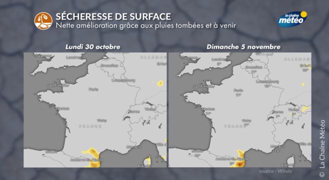 La sécheresse de surface a quasiment disparu avec la reprise du courant océanique perturbé. Lundi 30 octobre, seule la plaine du Roussillon et l'est de la Corse étaient concernés par des sols encore assez secs. Partout ailleurs, la sécheresse de surface s'est résorbée. D'ici à la fin de la semaine, les Pyrénées-Orientales et l'est de la Corse seront les seules zones encore concernées par des sols secs.