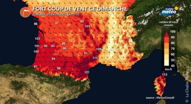 Le vent de sud se renforcera nettement de la Bretagne à la côte Aquitaine au cours de la nuit de samedi à dimanche, et c’est au moment de la bascule du vent au secteur ouest puis nord-ouest que les rafales maximales devraient être enregistrées. Sur la côte Aquitaine, dimanche matin, le vent soufflera en général entre 80 et 90 km/h avec des pointes à plus de 100 km/h. Dimanche après-midi, ce sera au tour du Massif central et de la Méditerranée d’être concernés. Le vent soufflera en tempête sur les cimes Auvergnates, ainsi qu’autour de la Méditerranée. Des rafales entre 100 et 110 km/h seront enregistrées sur ces régions, voire plus de 120 km/h sur le relief. La Corse sera touchée un peu plus tard dans l’après-midi et la soirée avec des pointes pouvant dépasser les 130 km/h sur les caps exposés.