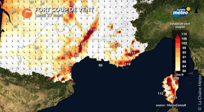 - vent violent ce matin près de la Méditerranée qui faiblit dans l'après-midi