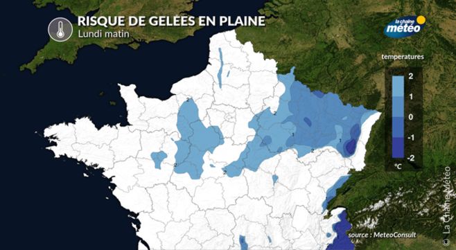 Tendance ultérieure : mardi, le temps est calme sur les ¾ du pays, avec des gelées assez fréquentes le matin sur une grande moitié est du pays, suivies d'un net redoux l'après-midi en Aquitaine en raison de l’orientation du vent au sud. Sur les régions voisines de la Manche, les nuages s'imposent avec quelques pluies en marge d'une perturbation circulant sur les îles britanniques.