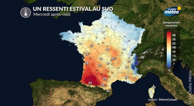 Le flux perturbé britannique descendra sur les régions voisines de la Manche, apportant des pluies accompagnées d'un net renforcement du vent. Partout ailleurs, le temps s'annonce à nouveau très calme. Avec l'orientation du vent au Sud, la douceur s'imposera partout l'après-midi. Il fera chaud au sud de la Garonne avec des pointes de 25 à 28°C entre Bordeaux, Biarritz et Toulouse l'après-midi. La barre des 20°C pourrait être approchée pour la 1ère fois de l'année sur Paris.