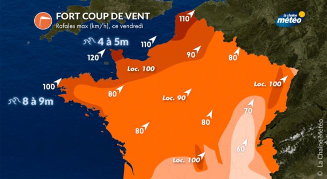 La force des vents faiblira lentement vendredi en cours de journée avec la progression de la dépression vers la mer du Nord et son comblement, mais les rafales resteront soutenues tout au long de la journée sur une large moitié nord. Les vents forts s'étendront vers le quart nord-est. Dans les terres, les rafales atteindront les 80 à 90 km/h de la Normandie aux Hauts-de-France (rafales à 100 km/h en bord de mer). Elles souffleront entre 70 et 80 km/h de façon généralisée sur un large tiers nord-est, ce qui n'est pas anodin.