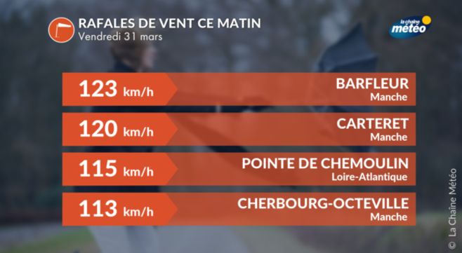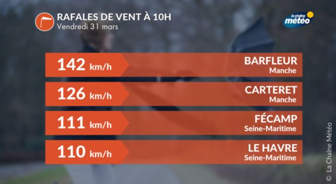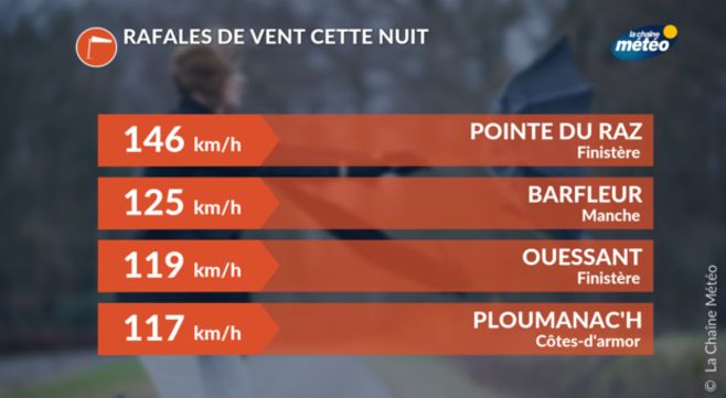 À 9h44, les plus fortes rafales se concentrent désormais entre la pointe du Cotentin et la Seine-Maritime avec encore 125 km/h à Barfleur (Manche), 113 km/h au Cap de la Hague (Manche), 109 km/h à Fécamp (Seine-Maritime) et 97 km/h à Cherbourg (Manche).