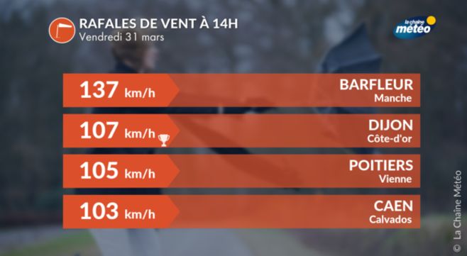 A 14h50, le vent souffle encore violemment sur les côtes de la Manche avec jusqu'à 137 km/h en rafales à Barfleur dans le Cotentin, 114 km/h à Fécamp, 107 km/h à Port-en-Bessin. Dans les terres du nord-ouest, les rafales atteignent 82 km/h à Lille, 87 km/h à Abbeville et 103 km/h à Caen.
