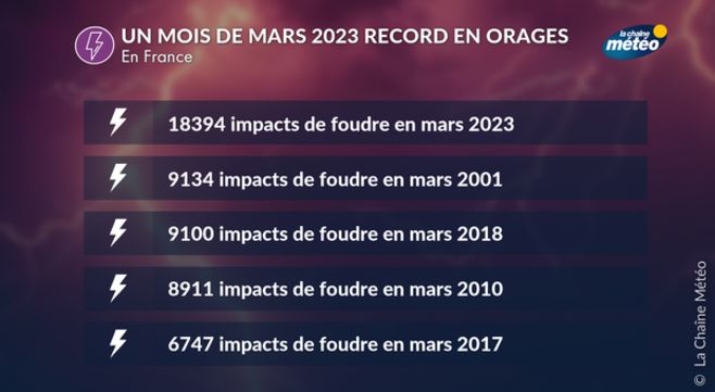 Avec 18 394 impacts de foudre observés entre le 1er et le 31 mars, ce mois a été le plus foudroyé depuis une trentaine d'années. L'ancien record datant de mars 2001 a été pulvérisé avec 9 134 impacts de foudre, selon les données de Météorage. Les forts contrastes de températures et les flux de sud-ouest chargés en humidité expliquent en grande partie ce mois très orageux.