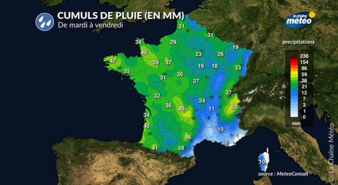 En effet, de mardi à vendredi, de bonnes pluies arroseront les 3/4 du pays. Comme elles se produisent sous des températures fraîches, elles apportent un bon apport d'eau aux nappes phréatiques. Il s'agit également d'une bonne nouvelle pour la végétation en pleine croissance. Seul un petit quart sud-est reste à l'écart de cette agitation. En effet, hormis un risque d'averses entre mercredi soir et jeudi matin, aucune précipitation n'est attendue du Roussillon à la Provence côte d'Azur, avec une sécheresse qui va continuer de s'aggraver pour cette partie du pays.