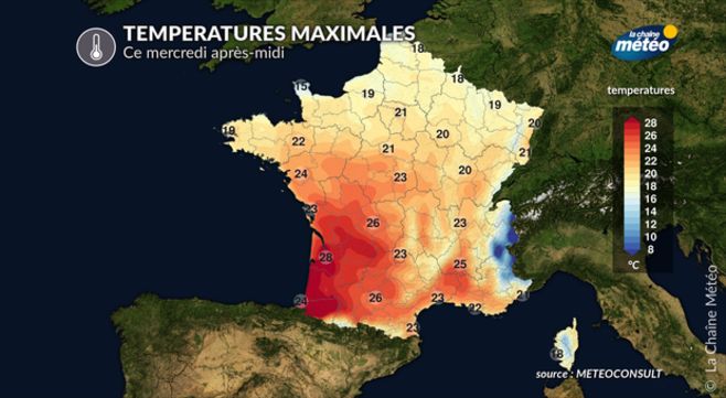 Mercredi, ce sera une belle et chaude journée après la grande fraîcheur du matin. La France passera sous protection anticyclonique avec du soleil partout. La fraîcheur parfois marquée au lever du jour sera vite remplacée. Il faut néanmoins surveiller un risque de gelées blanches sur l'extrême nord-est, avant que l'atmosphère ne se réchauffe très rapidement avec une grande douceur l'après-midi. Un pic de forte chaleur est même attendu dans le sud-ouest avec 31°C sur le Pays Basque.