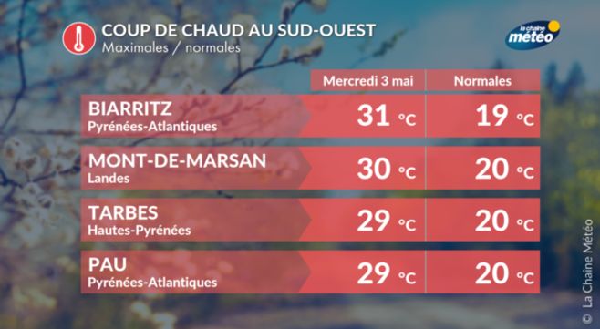 Les valeurs enregistrées seront loin des records pour cette période de l’année : les maximales atteindront entre 25 et 29°C mercredi, voire localement 30°C. Mercredi, le ressenti variera de 29°C à Toulouse à 33°C à Bayonne. L’absence de vent, malgré un soleil partiellement voilé, rendra l'ambiance estivale, digne du plein été.