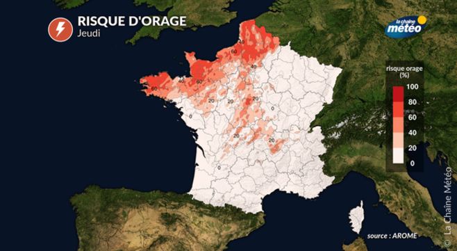 Pour l'Île-de-France et Hauts-de-France, le ciel est voilé le matin et des nuages moyens circulent en journée. Quelques ondées éclatent en fin d'après-midi et soirée avec un risque orageux plus marqué sur les Hauts-de-France.