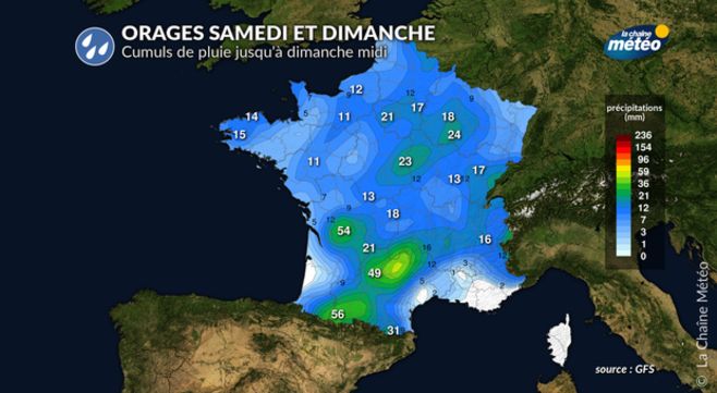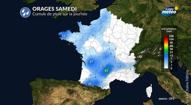 Le temps lourd et orageux samedi permettra à un front orageux de se développer en fin d'après-midi sur la Nouvelle-Aquitaine, avant de progresser en soirée sur la région Midi-Pyrénées, avec un risque de forts orages propices à des chutes de grêle entre les Pyrénées et l'Auvergne. Dans la nuit, les orages éclateront sur un axe allant des Pyrénées au centre-est, en s'atténuant en fin de nuit. Un communiqué spécial sera probablement émis au sujet de cette dégradation. On attend des cumuls pluviométriques très hétérogènes, pouvant atteindre localement 25 à 30 mm sous les orages les plus forts, ce qui rend possible de forts ruissellements, le tout accompagné d'une activité électrique assez intense.