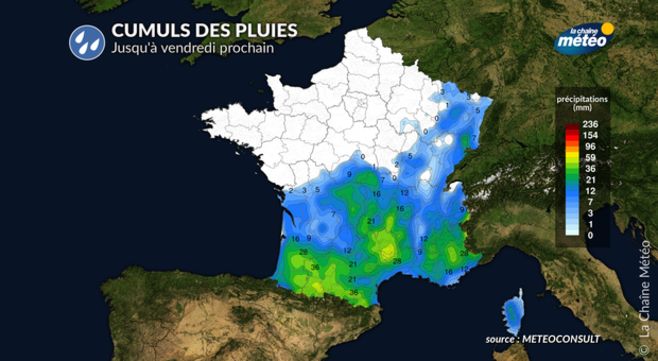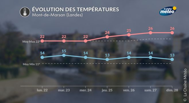 Le temps reste très sec sur les deux tiers nord-ouest alors que le risque orageux se maintiendra dans le sud, même s'il régresse au fil des jours. Les températures n'évoluent pas et restent proches des moyennes de saison. Le soleil s'impose de plus en plus au fil des jours.