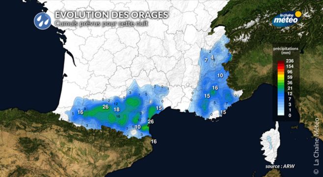 Les orages de l'après-midi se sont prolongés en soirée sur l'Occitanie, essentiellement en Languedoc-Roussillon et au sud de la Garonne. Les départements côtiers tels l'Hérault, l'Aude et même les Pyrénées-Orientales ont été touchés par de forts orages dans la nuit, avec des cumuls de pluie parfois significatifs. Il a été relevé localement plus de 80 mm en Ariège, soit l'équivalent d'un mois de pluie ! En Roussillon, les cumuls de pluie ont été très hétérogènes avec 5 mm à Perpignan, mais 10 fois plus à Canet-en-Roussillon avec 50,7 mm.