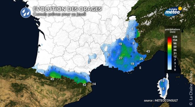 Le temps est donc très instable avec de forts orages en cours où à venir sur la chaîne des Alpes et la région PACA (Var, Est des Bouches-du-Rhône et Côte d'Azur). Ces pluies orageuses se poursuivront aussi sur les Pyrénées-Orientales. Des cumuls de 15 à 20 mm assez généralisés sont attendus, avec des cumuls plus importants sous les orages les plus violents.