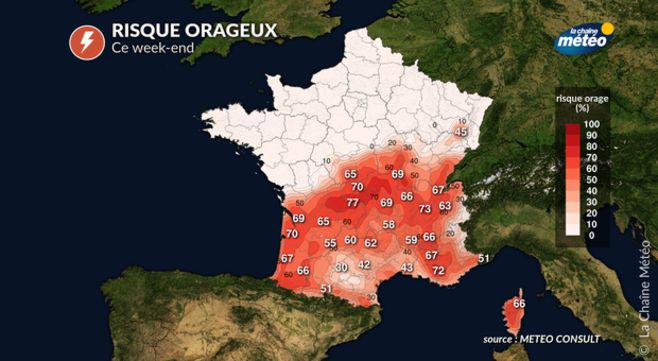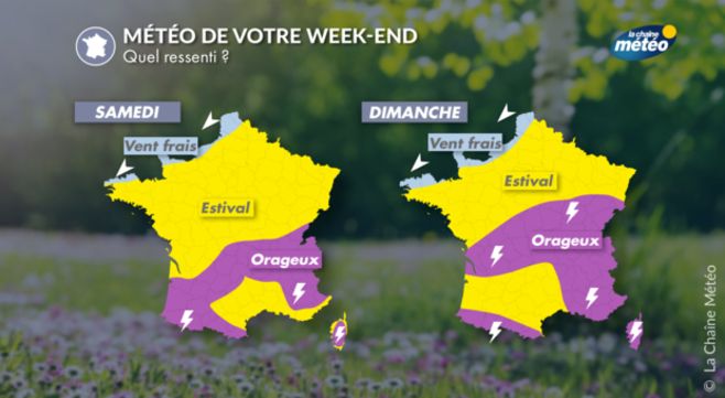 Ce samedi, il fait beau sur les 2/3 nord avec un soleil généreux, un toujours ce vent de nord-est encore présent le long des côtes de la Manche et de la mer du Nord. Au sud, le ciel prend un aspect menaçant l'après-midi avec un risque orageux marqué, surtout en montagne, où les randonneurs et fans de dénivelé doivent se méfier et anticiper ces situations. D'une façon générale, les orages éclateront du sud de l'Aquitaine au Limousin, Massif-Central et aux Alpes.