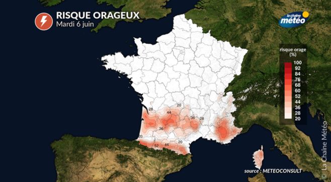 Des orages localisés ponctuellement forts se développeront des Pyrénées et du bassin aquitain aux Alpes jusqu'au Jura en passant par le Massif central l'après-midi et se maintiendront jusqu'au soir. Ces orages seront électriques, ponctuellement accompagnés d'un peu de grêle.